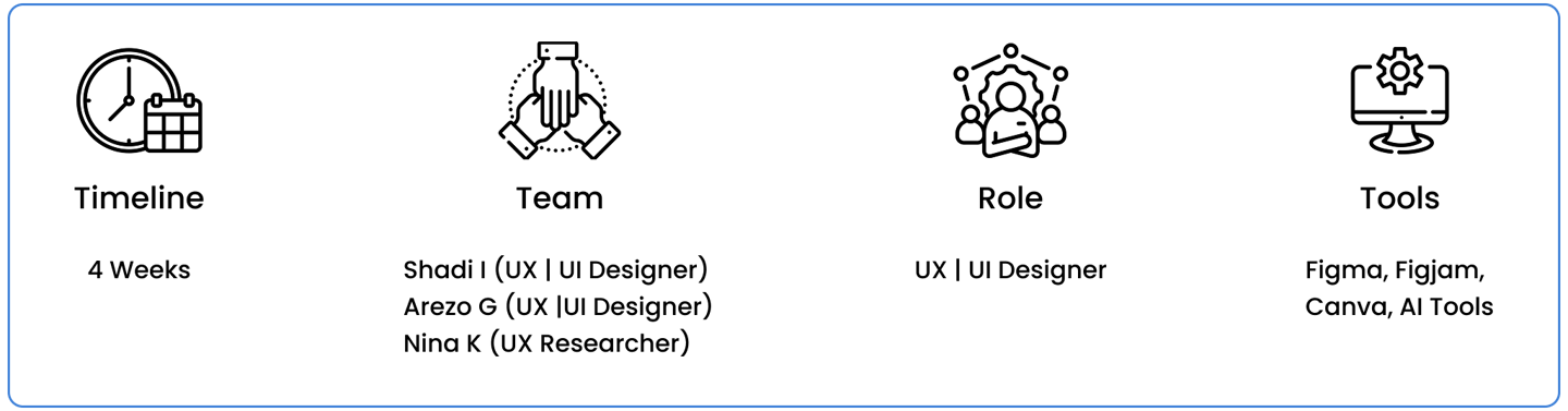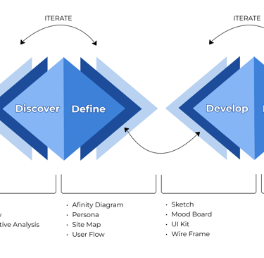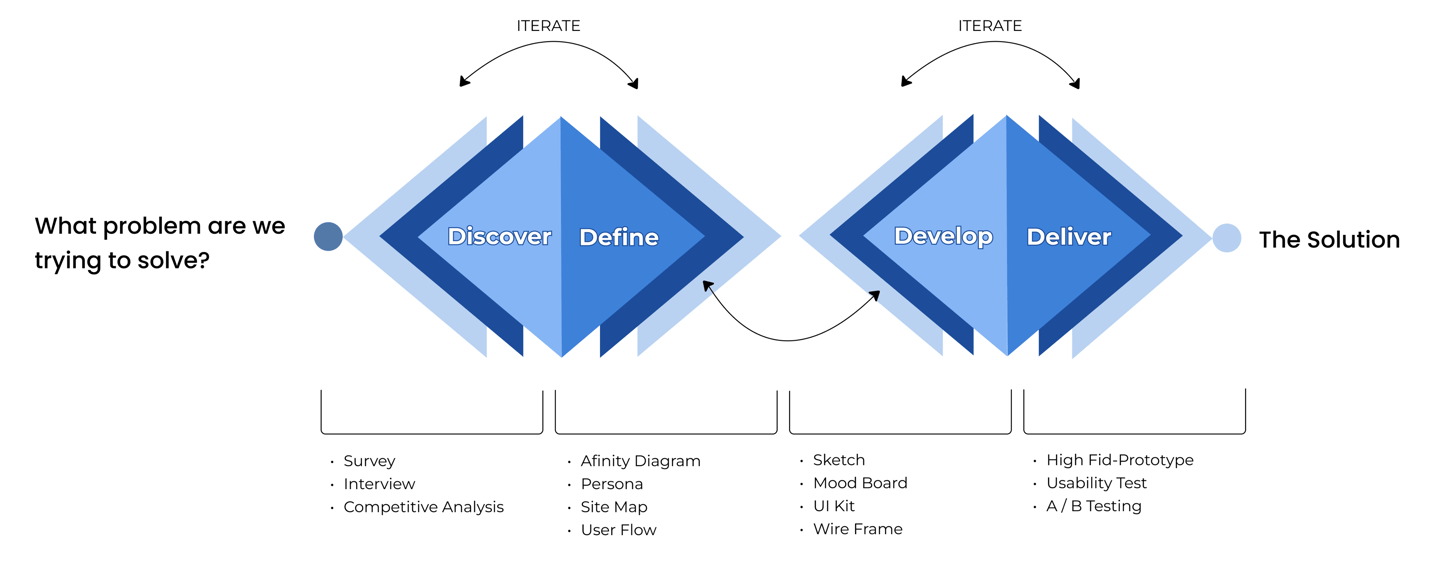 My team of 2 ran a double Diamond method based on the Design Thinking Methodology. It was not a linear path, we bounced between stages as the project progressed.