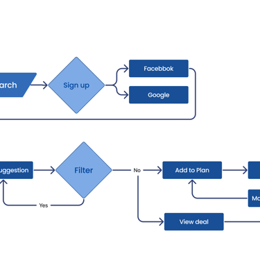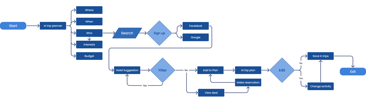 In the user flow, we aim to show how the user selects a hotel and adds it to their plan to create a personalized itinerary powered by AI.