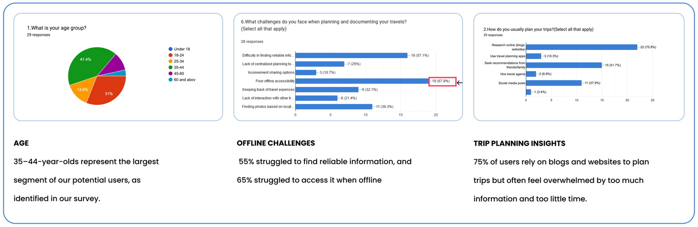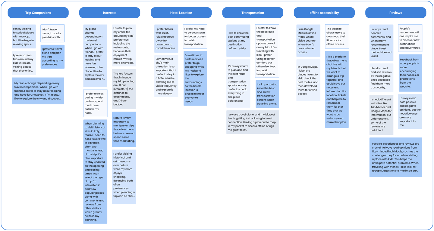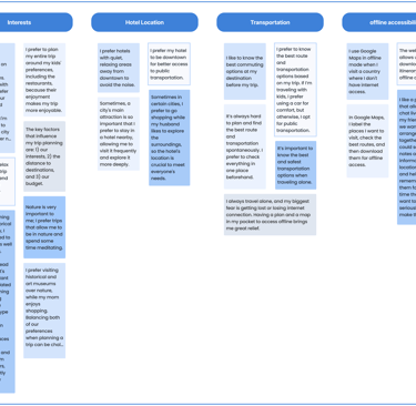After the survey, we interviewed 7 participants to gain deeper insights into their pain points, focusing on improving travel scheduling through a powerful AI search engine.