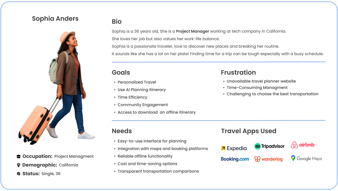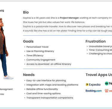 The insights I gained from surveys and interviews helped shape the persona. Ana’s main goal is to find a trustworthy, personalized travel plan for a short-term local travel experience to save time.